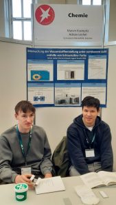 Die Spannung bei der Preisverleihung bei der Feierstunde am Mittwoch in der Aula der TU Clausthal war sehr groß. Am Ende dürfen sich Marvin und Adrian über den hervorragenden 2. Platz im Fachbereich Chemie freuen und mussten sich nur einer Teilnehmerin geschlagen geben, die mit ihrem Projekt letztes Jahr schon den Landeswettbewerb gewonnen hat und dieses nun weiterentwickelt hat.
