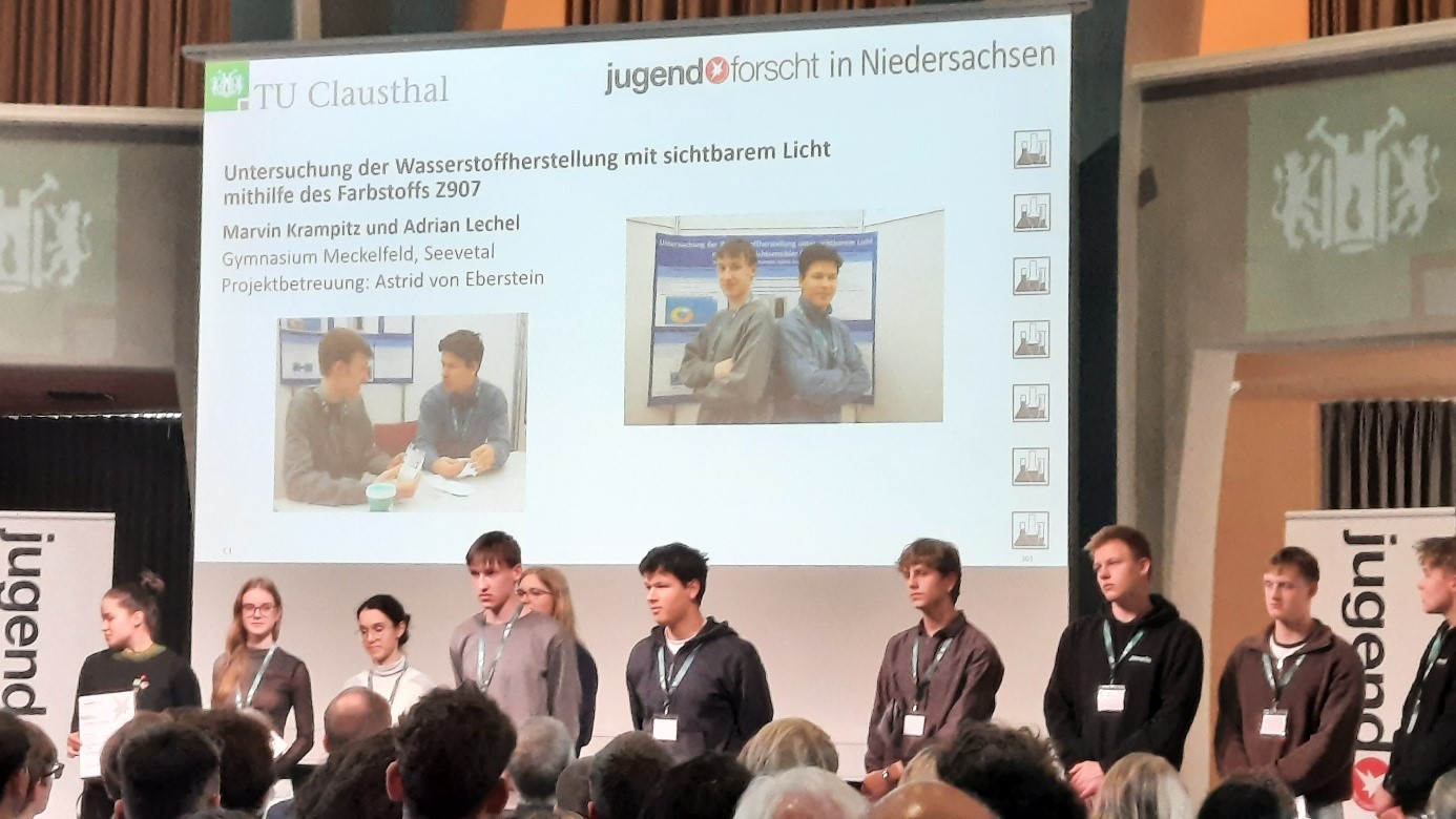 Die Spannung bei der Preisverleihung bei der Feierstunde am Mittwoch in der Aula der TU Clausthal war sehr groß. Am Ende dürfen sich Marvin und Adrian über den hervorragenden 2. Platz im Fachbereich Chemie freuen und mussten sich nur einer Teilnehmerin geschlagen geben, die mit ihrem Projekt letztes Jahr schon den Landeswettbewerb gewonnen hat und dieses nun weiterentwickelt hat.