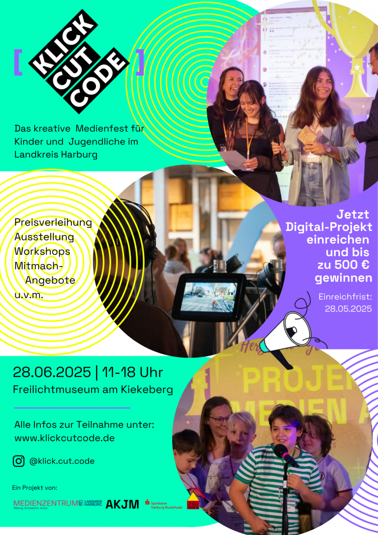 KLICK CUT CODE ist das Medienfest für junge kreative Köpfe im Landkreis Harburg. Kinder, Jugendliche und junge Erwachsene (bis 20 Jahre) können ihre digitalen Medienprojekte einreichen – egal ob Filme, Musik, Games, Animationen oder Programmierarbeiten. Die Beiträge werden ausgestellt und mit viel Glück mit bis zu 500 € Preisgeld ausgezeichnet. Medienfest: 28. Juni 2025 im Freilichtmuseum…