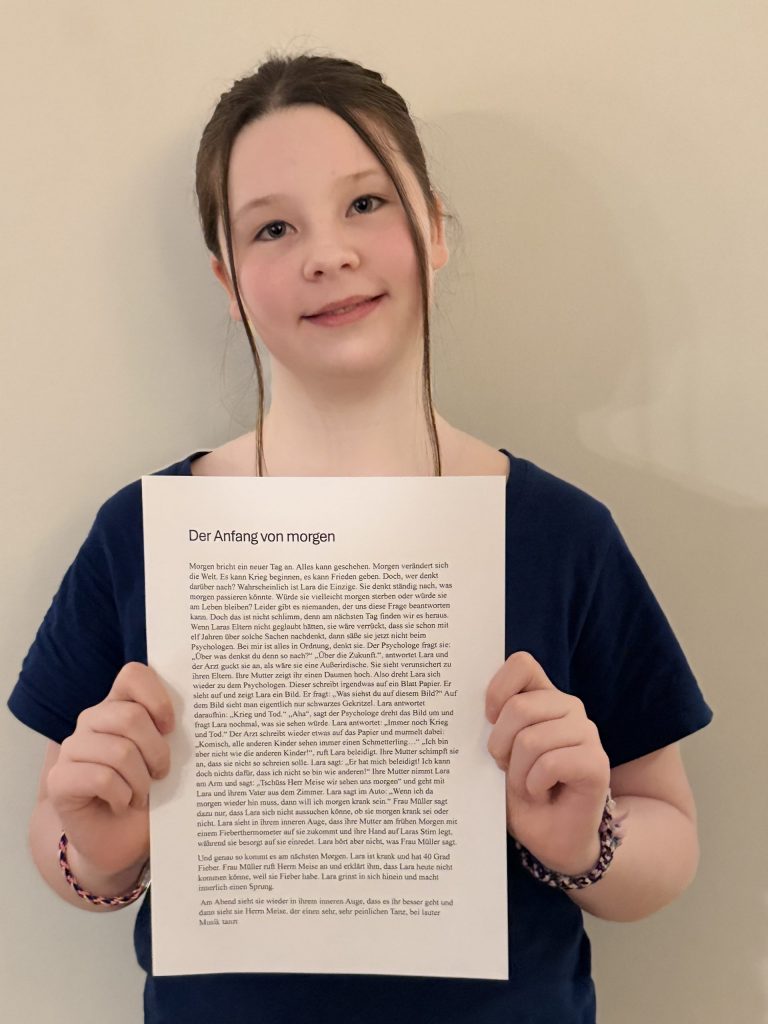 Liebe Schüler, liebe Schülerinnen, ich darf euch von meiner Teilnahme am Schreibwettbewerb „#MachtText“ des Literarischen Zentrums Göttingen berichten. Ich habe die Information bekommen, dass es einen Schreibwettbewerb gibt und wollte unbedingt mitmachen. Also habe ich zum vorgegebenen Thema „Der Anfang von morgen“ eine Geschichte geschrieben. Bei diesem Schreibwettbewerb gibt es verschiedene Altersgruppen (in meinem Fall 5. bis 6.…